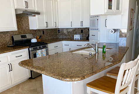 with granite kitchen counters, travertine floors, a marble fireplace, and ceiling fans throughout.