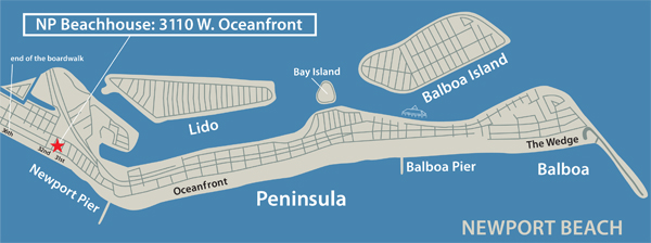 - Take the 5 or 405 freeways south to the 55 freeway south towards Newport Beach. Follow the signs for the 73 South as it leads to the 55. Take the 55 freeway all the way down until the freeway ends. Keep going straight ahead on Newport Blvd. and you'll reach the Balboa Peninsula. Continue to 32nd street and turn right (Albertson's Market Shopping Center). Go to the signal and turn left onto Balboa Blvd. Almost immediately turn right onto 31st street. Drive almost to the end of 31st street and turn right into the alley. Approach the house from the alley. 3110 W. Oceanfront will be the 6th house.